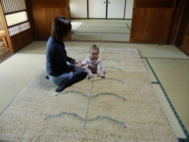 おかあさんに抱かれている赤ちゃんがこれからギャッベに